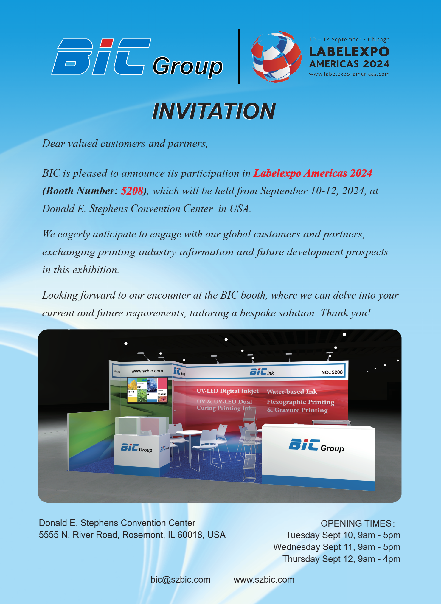 BIC is pleased to announce its participation in Labelexpo Americas 2024(Booth Number: 5208), which will be held from September 10-12, 2024, at Donald E. Stephens Convention Center in USA.